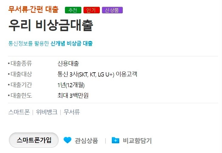 ▶우리은행 우리 비상금 대출 한눈에 알아보기