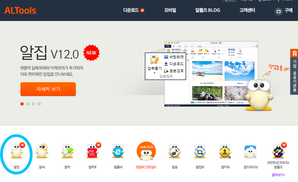 2. 위에 사진처럼 알툴즈 공식 홈페이지 하단에 알집이 있습니다. 알집을 클릭합니다.