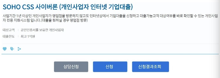사업기간이 1년이상인 개인사업자로 공인인증서(다른 금융기관의 공인인증서도 가능)를 보유한 고객이라면 신한은행 SOHO CSS 사이버론 대출을 받을 수 있습니다.