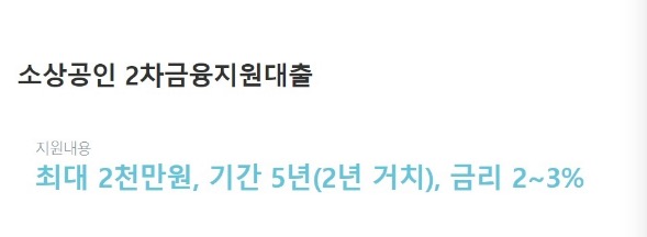 소상공인 2차 금융지원 대출은 개인사업자 소상공인분들을 위한 상품입니다. 자금지원 대출상품으로 최대 2천만원을 5년간, 2~3%의 금리로 금액을 지원해줍니다. 개인사업자 소상공인분들에게만 자금지원을 해주는 정부지원 소상공인 2차 금융지원 대출에 관련된 자세한 내용은 아래에서 설명하도록 하겠습니다.