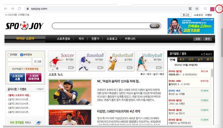 스포조이 사이트에 들어가면 우측 상단에 점 3개를 클릭합니다. 스포조이 사이트는 맨 아래쪽에 넣어 두겠습니다.