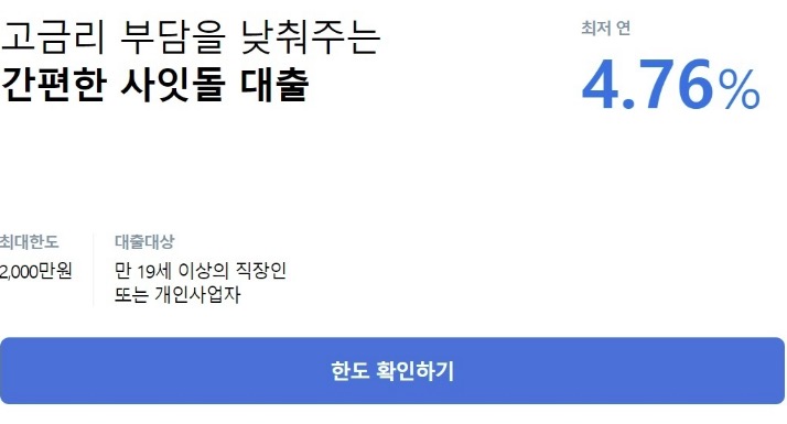 대출한도는 최대 2,000만 원까지 입니다. 한도는 신용도에 따라 조금씩 달라집니다.