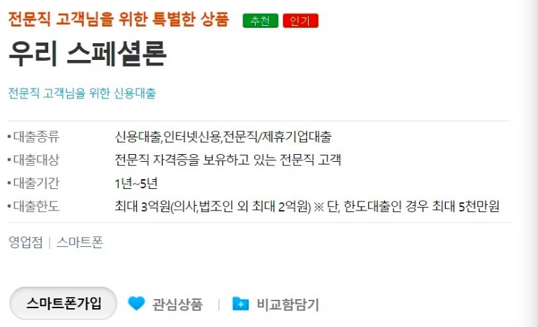 우리은행 우리 스페셜론은 전문직 고객을 위한 신용대출상품입니다. 전문직 자격증을 보유하고 있는 고객이 1년에서 5년까지, 최대 3억원의 대출을 받을 수 있는 대출이며, 우리은행 스마트폰 어플 (우리 WON)을 통해 대출신청이 가능한 상품입니다. 우리은행 우리 스페셜론과 관련된 자세한 내용은 아래에서 설명하도록 하겠습니다.